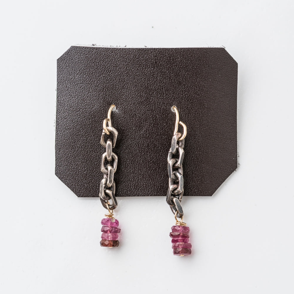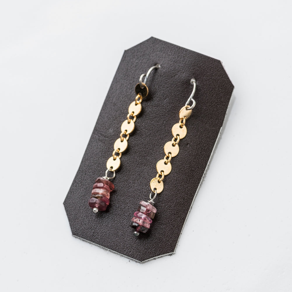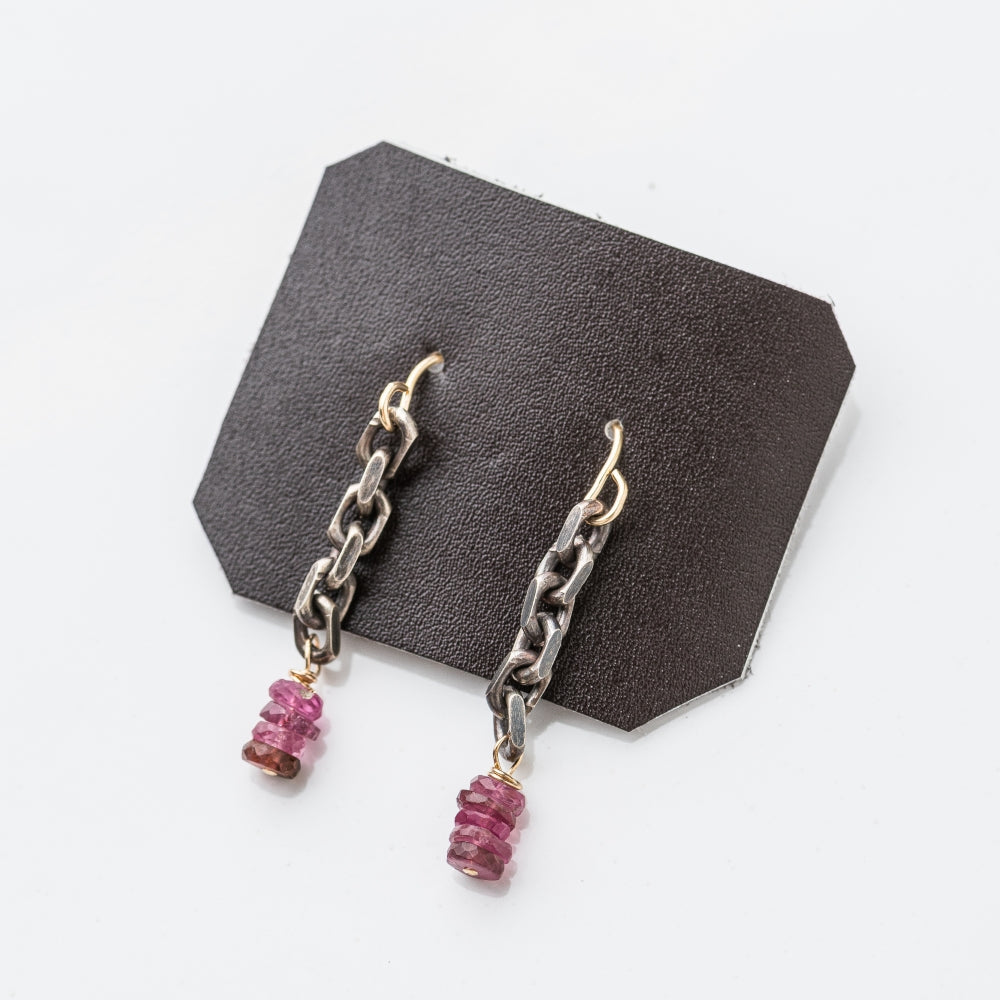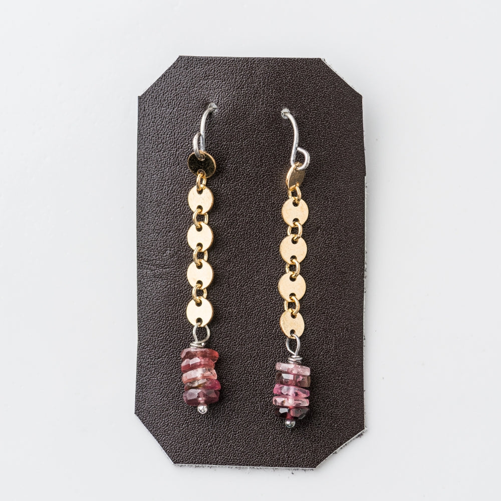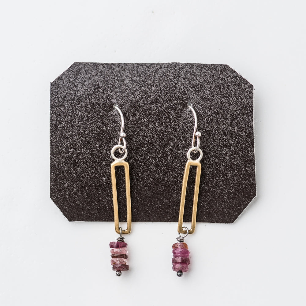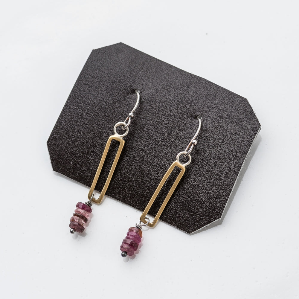 Stacked pink tourmaline stones glow within bronze frames—an elegant pairing of vibrant color and warm metal, crafted with modern sophistication.