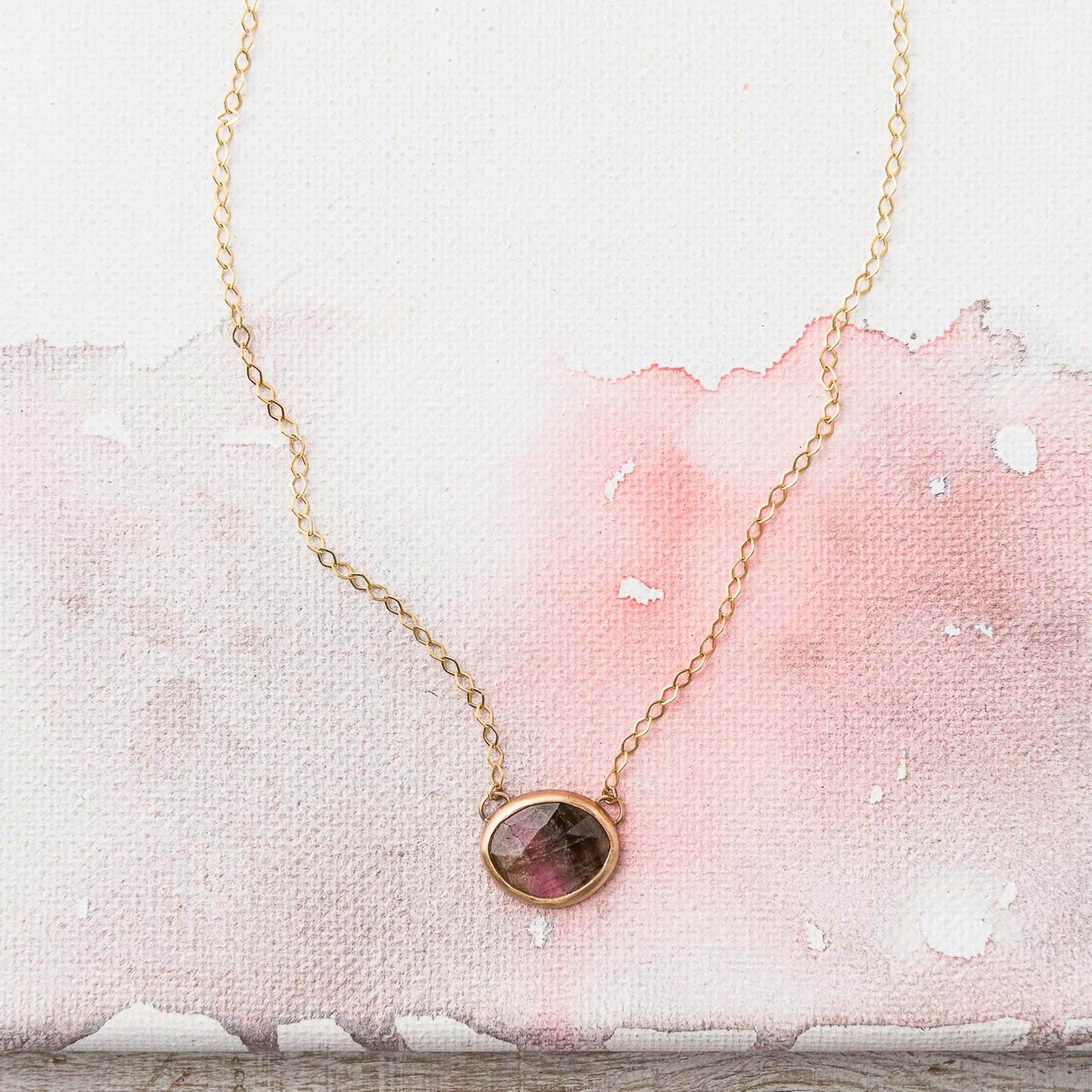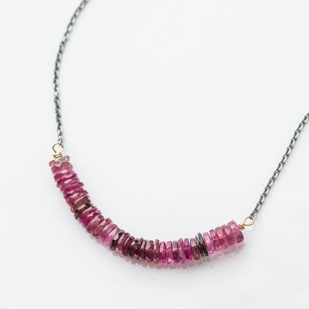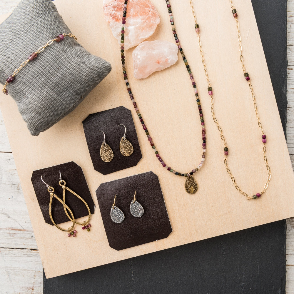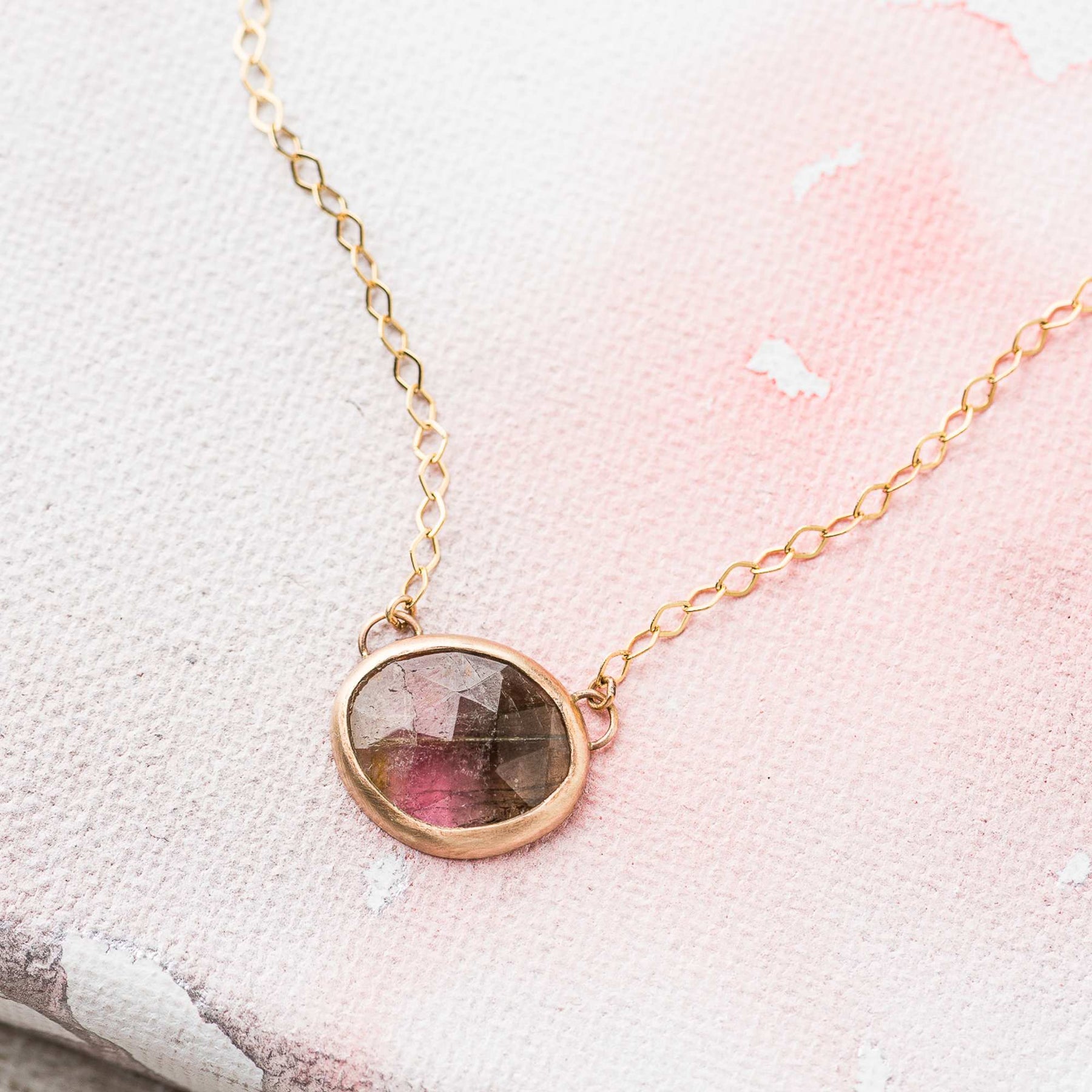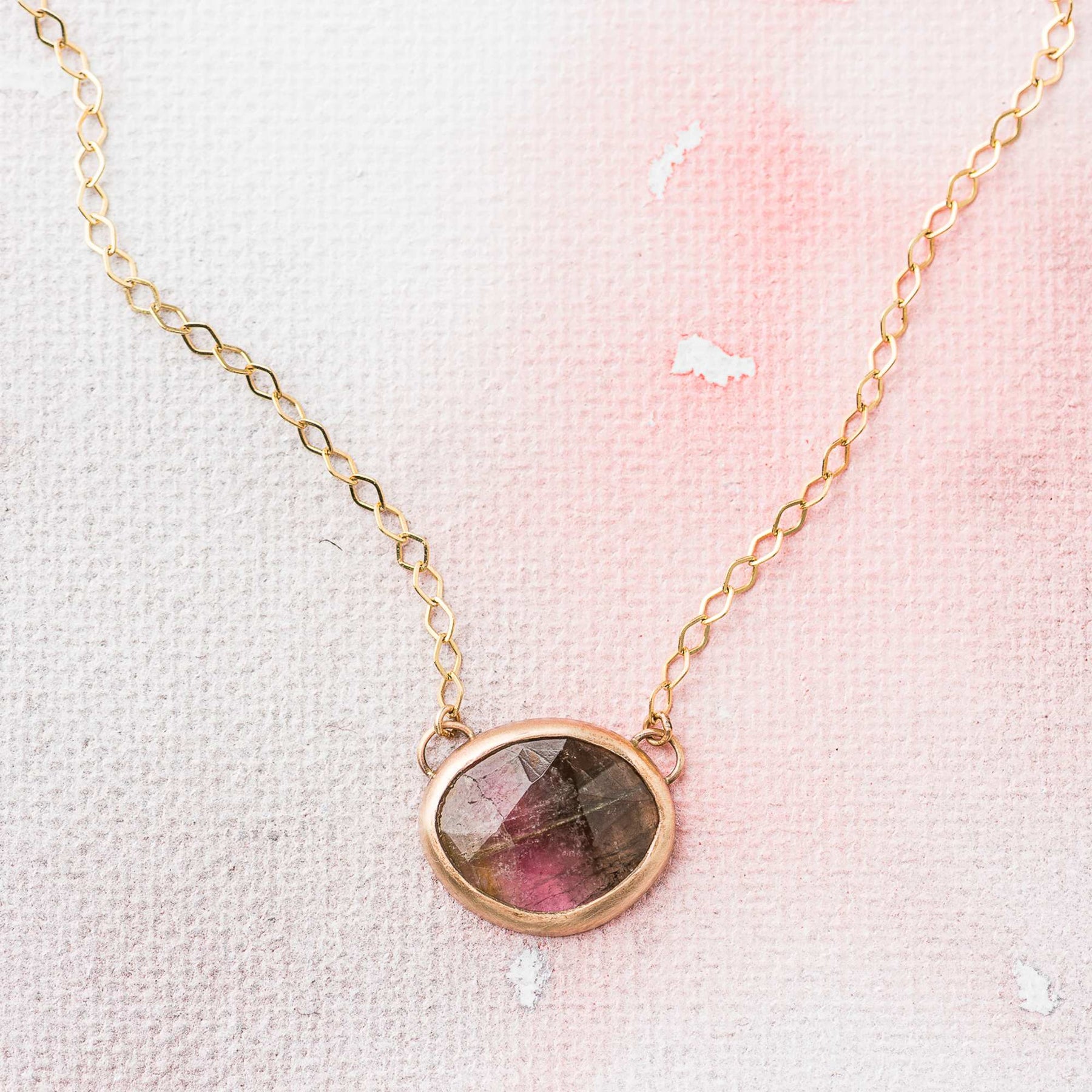 Stacked pink tourmaline stones glow within bronze frames—an elegant pairing of vibrant color and warm metal, crafted with modern sophistication.