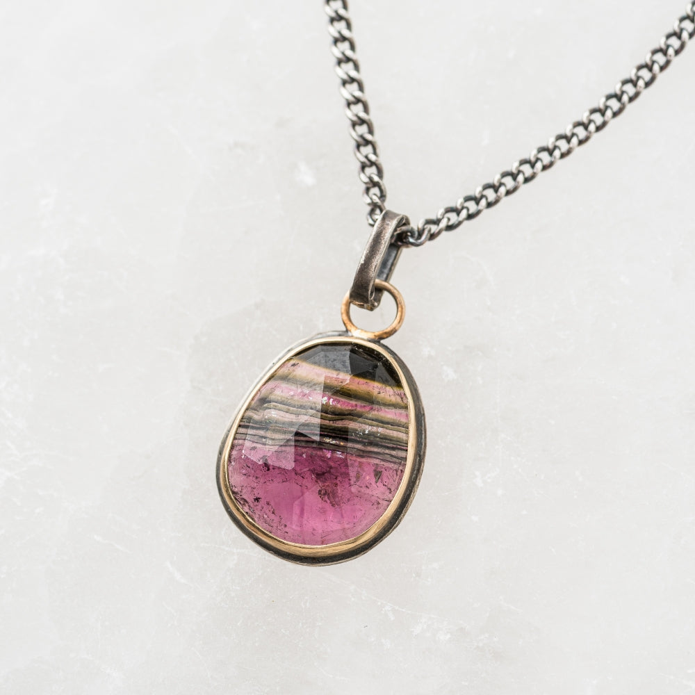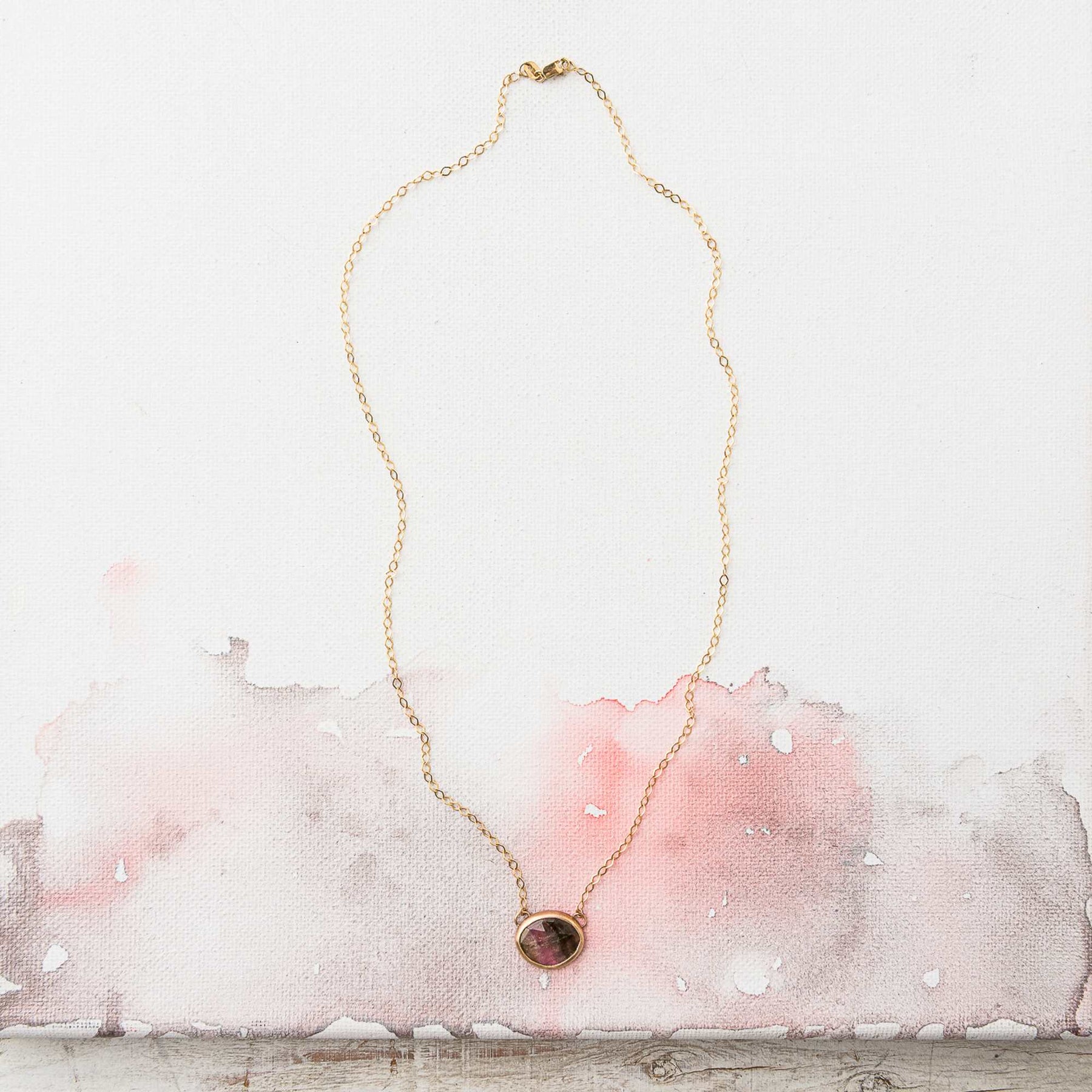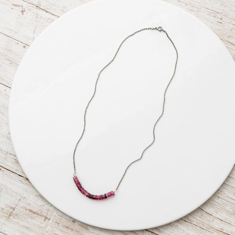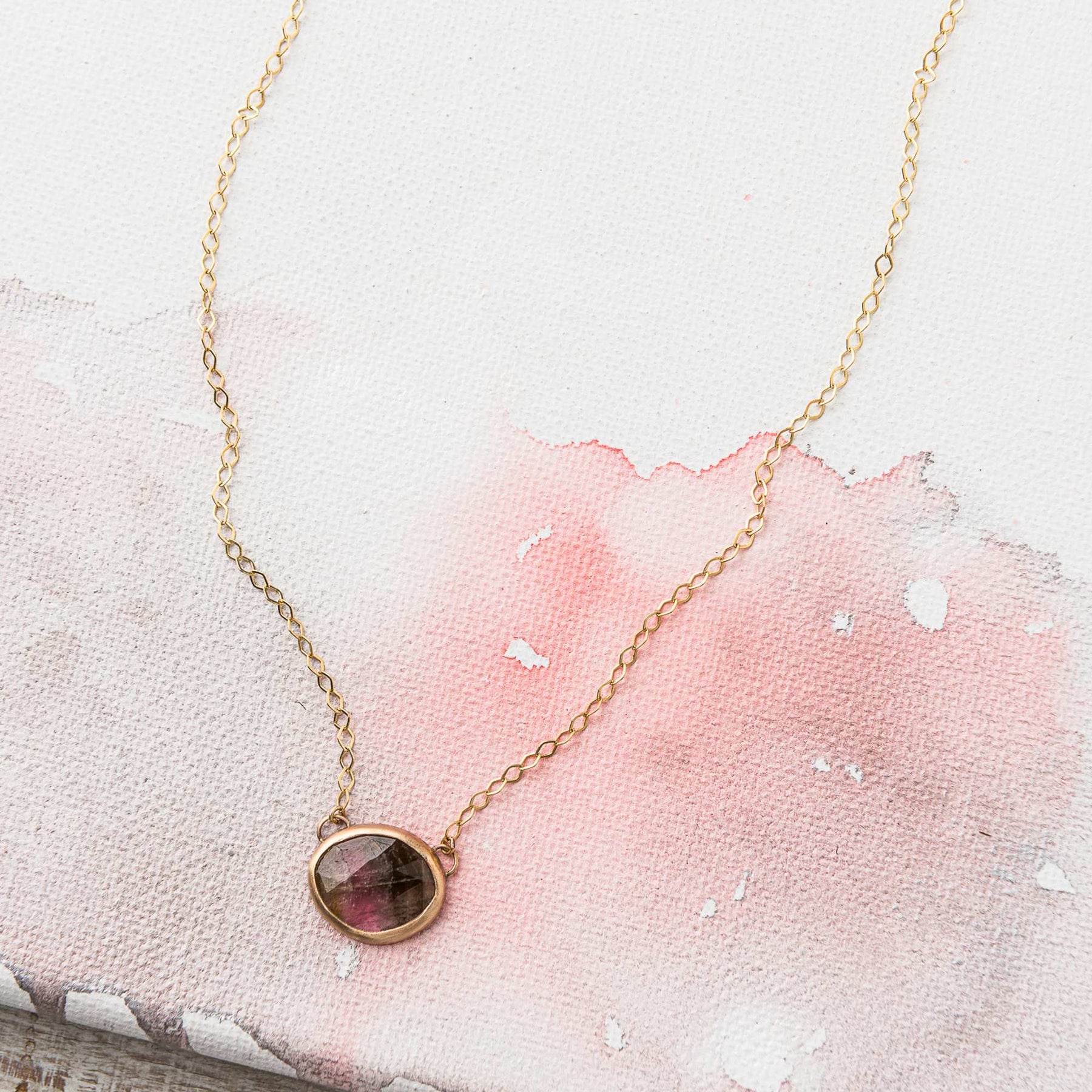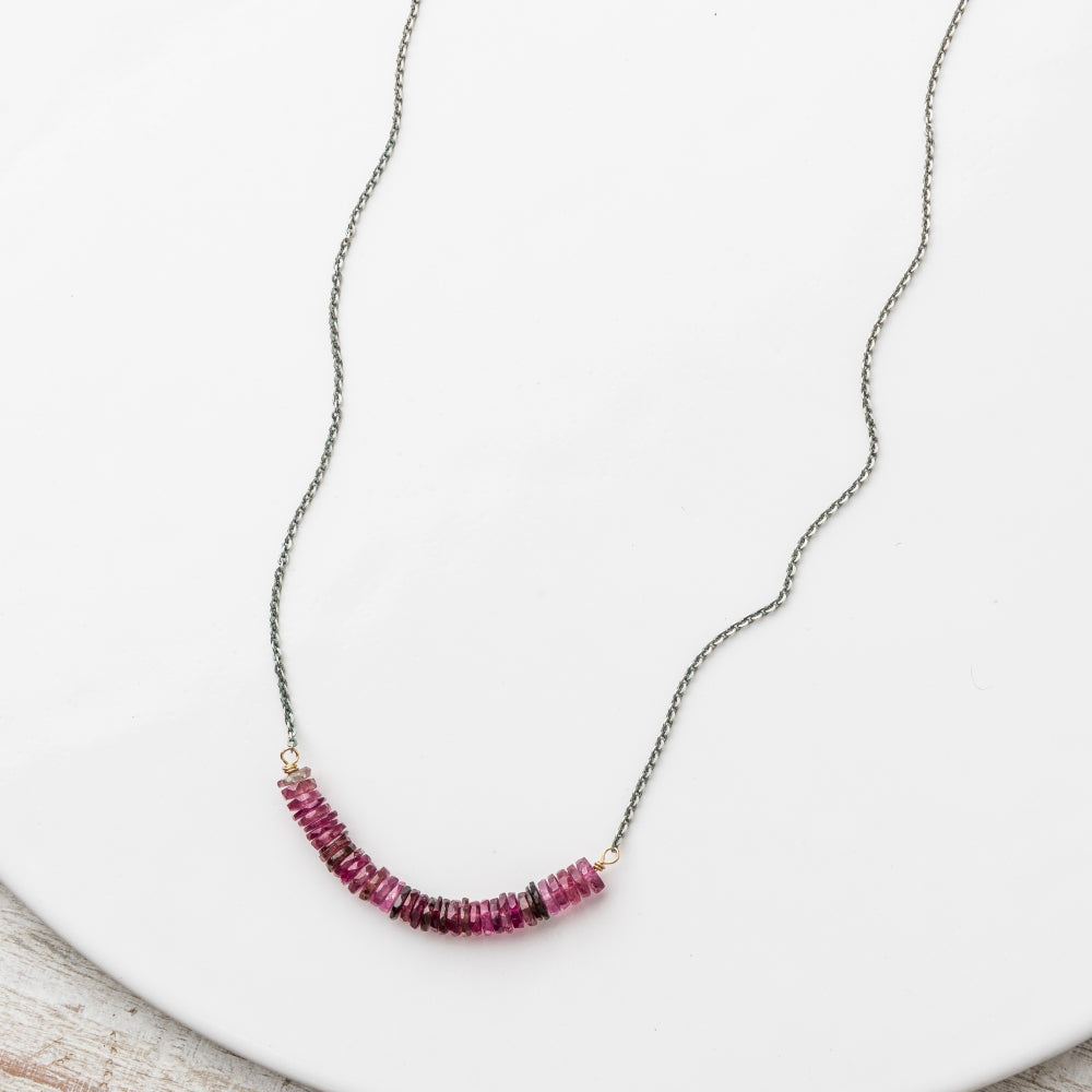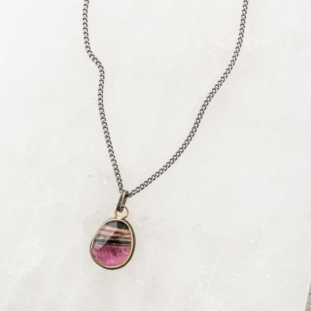 Stacked pink tourmaline stones glow within bronze frames—an elegant pairing of vibrant color and warm metal, crafted with modern sophistication.
