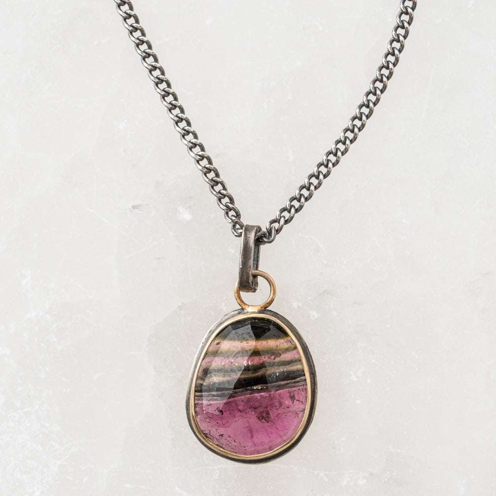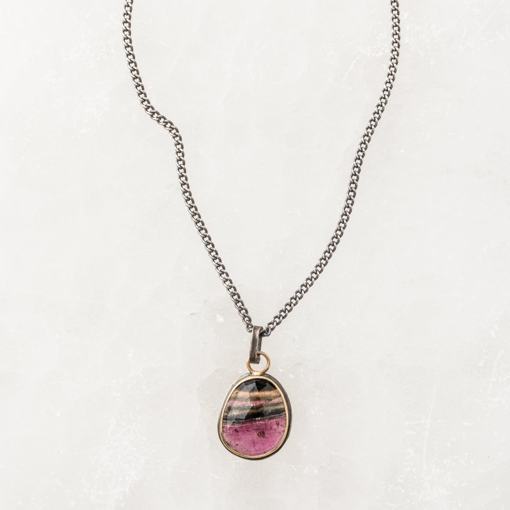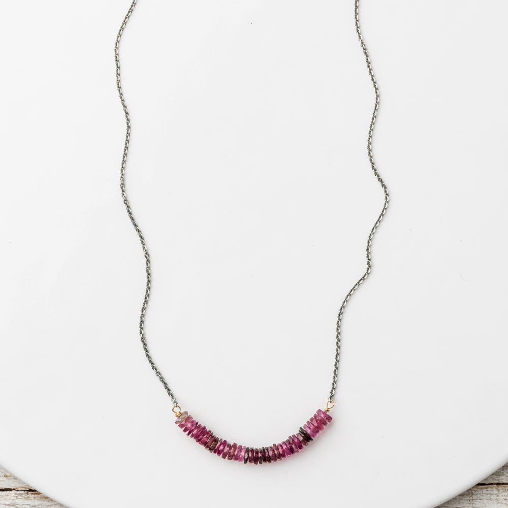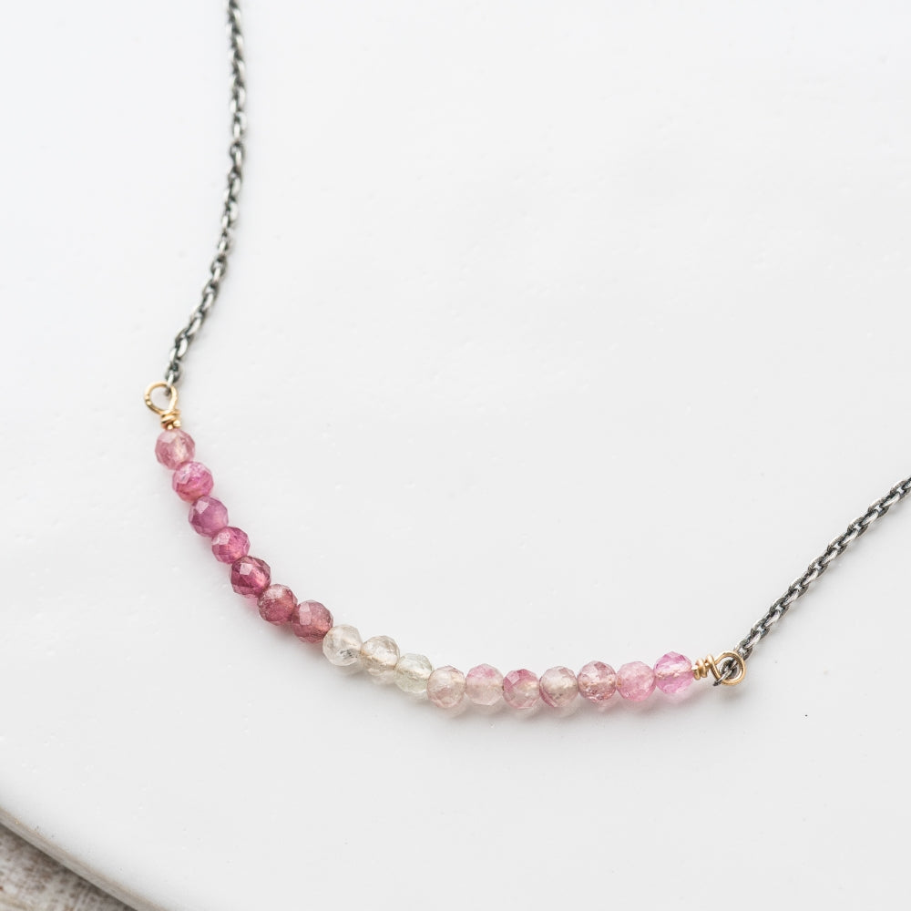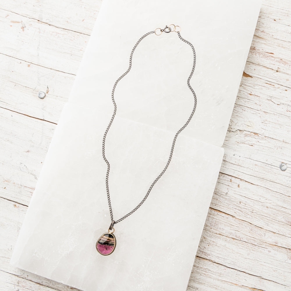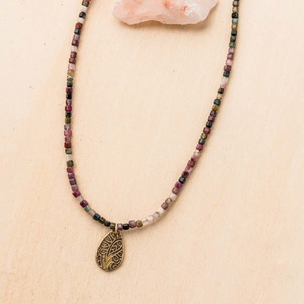 Stacked pink tourmaline stones glow within bronze frames—an elegant pairing of vibrant color and warm metal, crafted with modern sophistication.