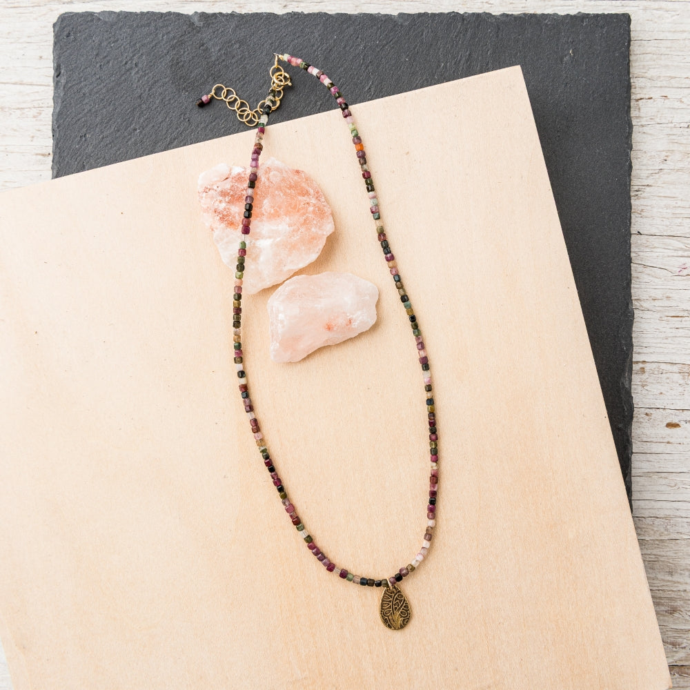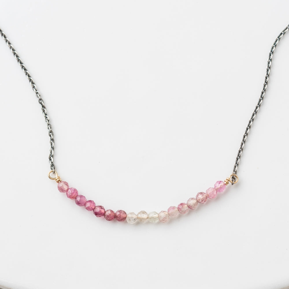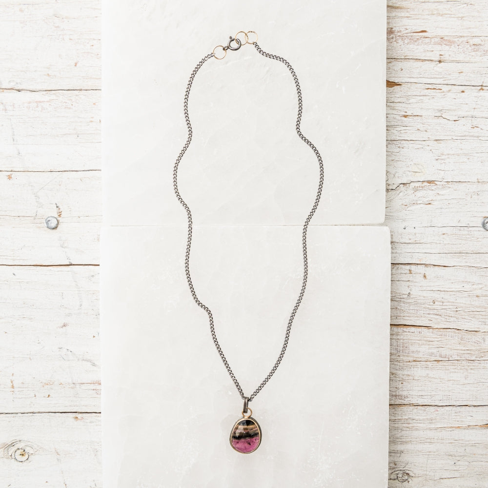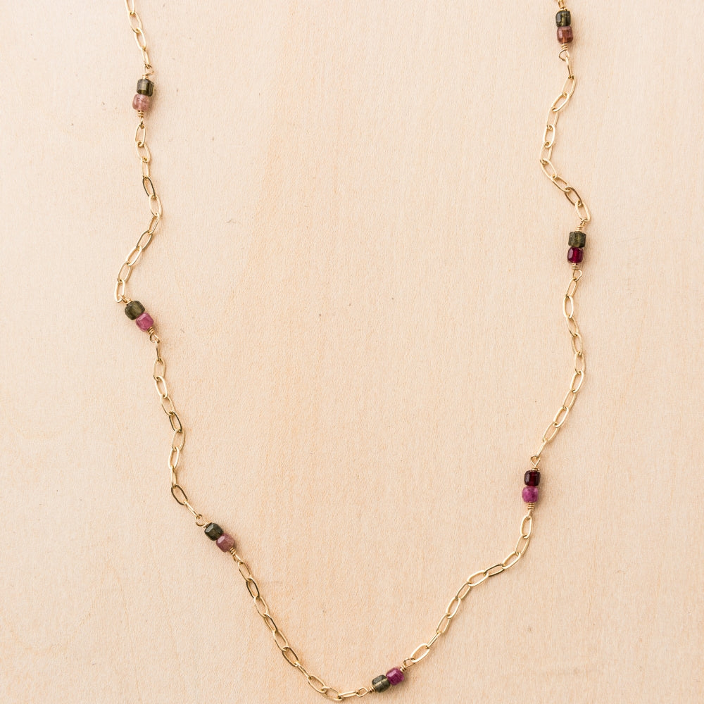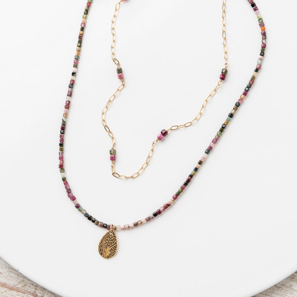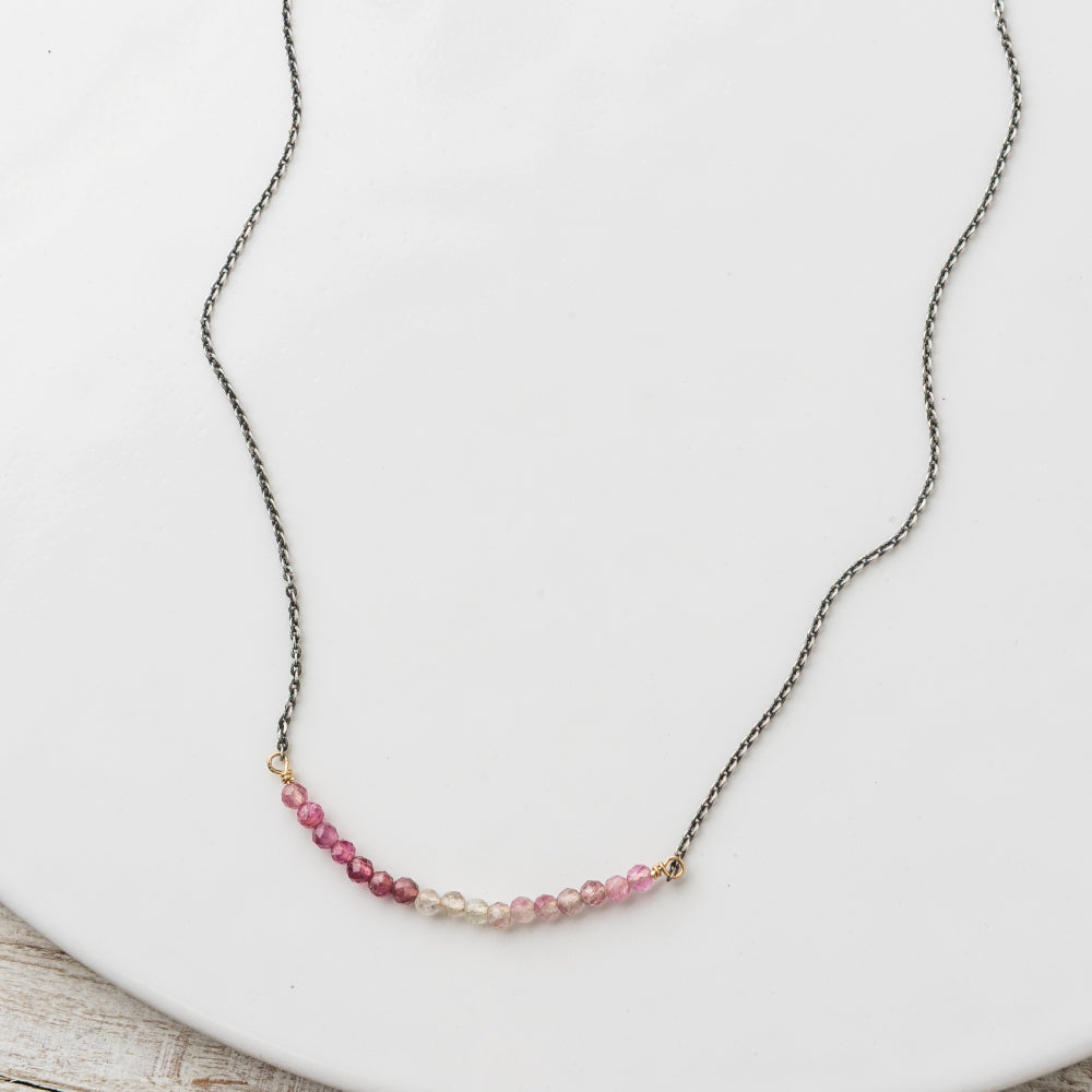 Stacked pink tourmaline stones glow within bronze frames—an elegant pairing of vibrant color and warm metal, crafted with modern sophistication.