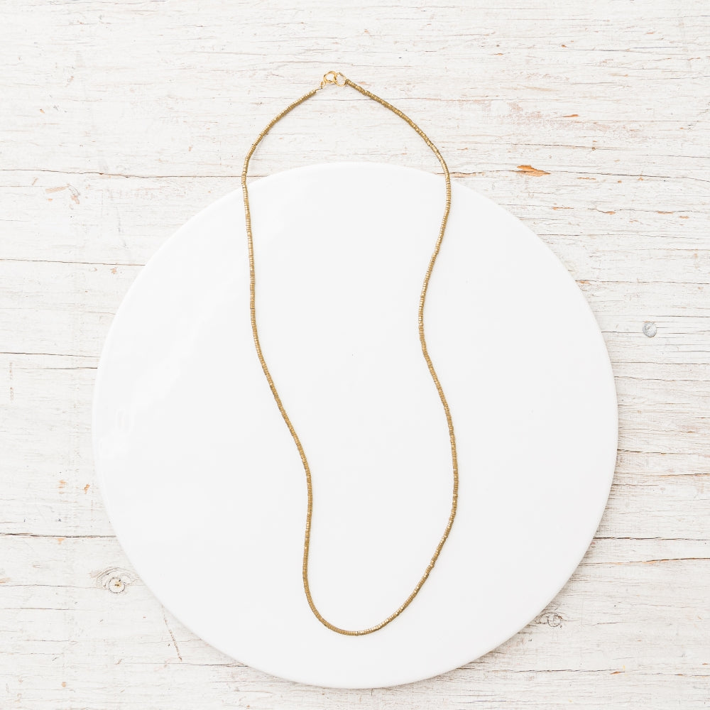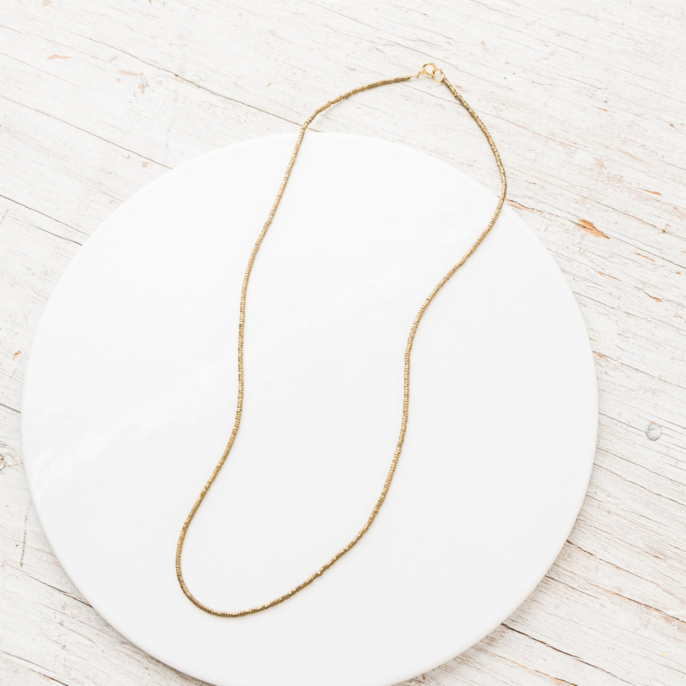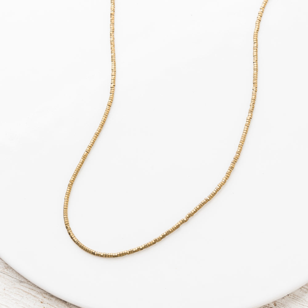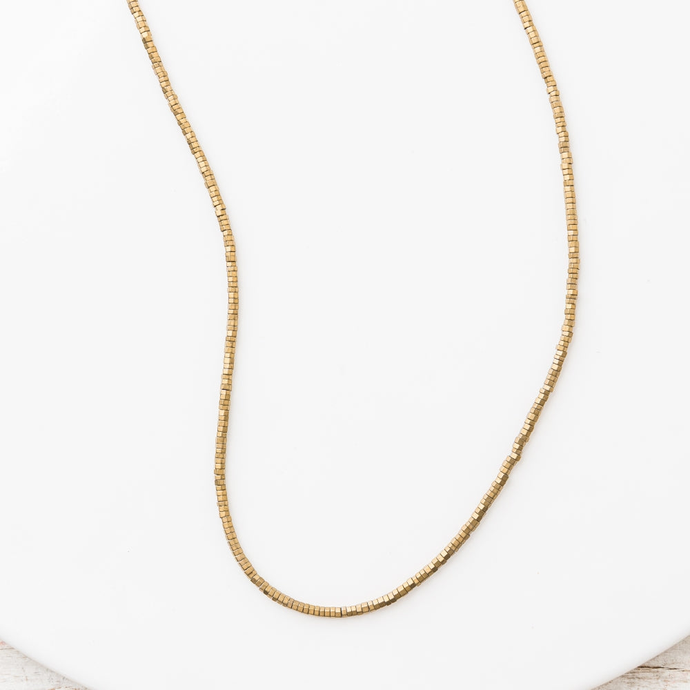 Regular price $ 124.00Golden pyrite micro hex beads shimmer with faceted brilliance, creating a sleek, modern necklace that radiates refined, effortless elegance.