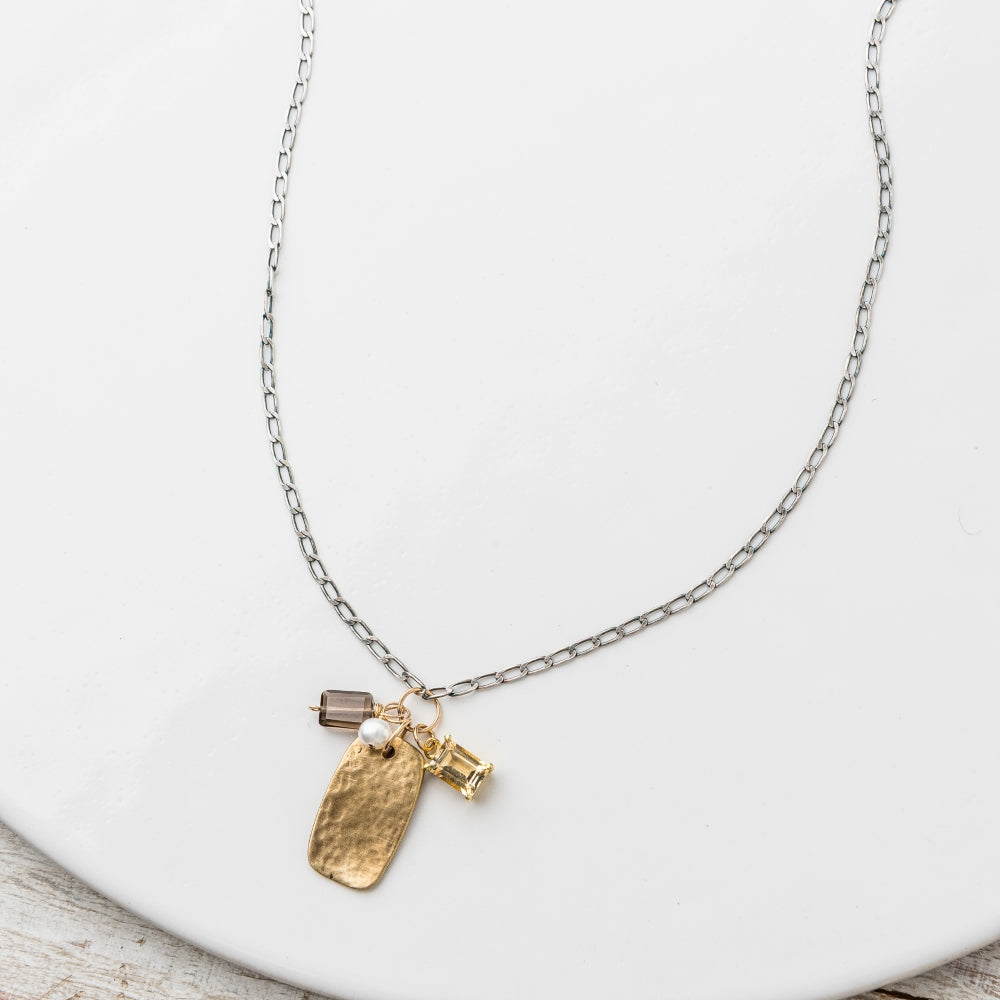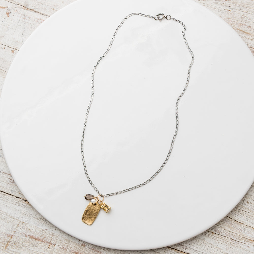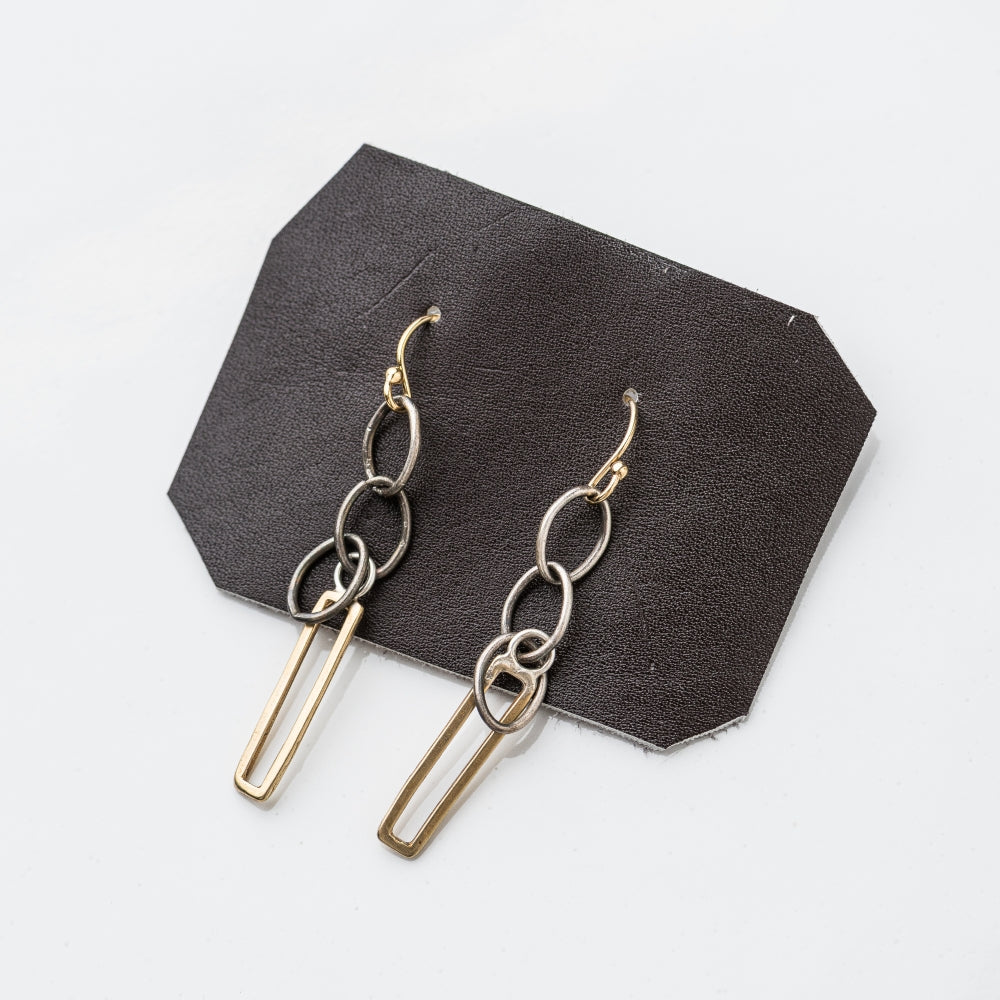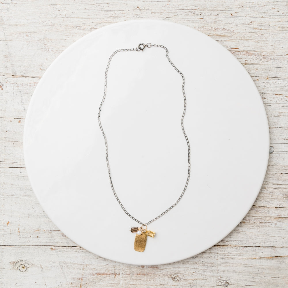 A striking lab-grown round diamond sits atop an organic shape of 14k yellow gold. The stone, set in a 14k gold bezel, contrasts beautifully with the sterling silver ring shank that is held by it.