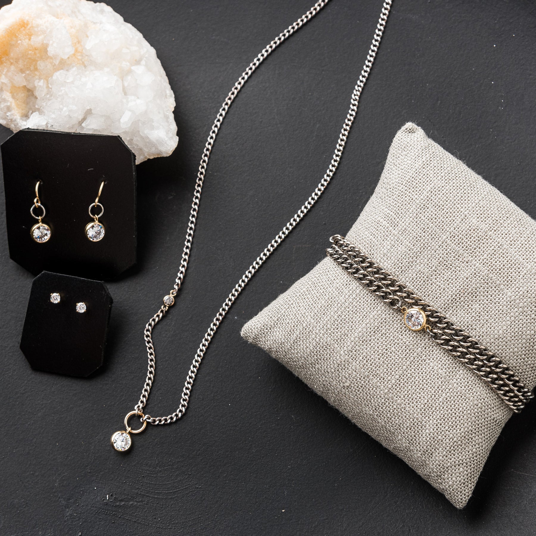 The stone falls from a 14k gold fill ring welded shut onto a sterling silver patinaed curb chain. We've added a smaller cubic zirconia accent to one side for asymmetrical interest.